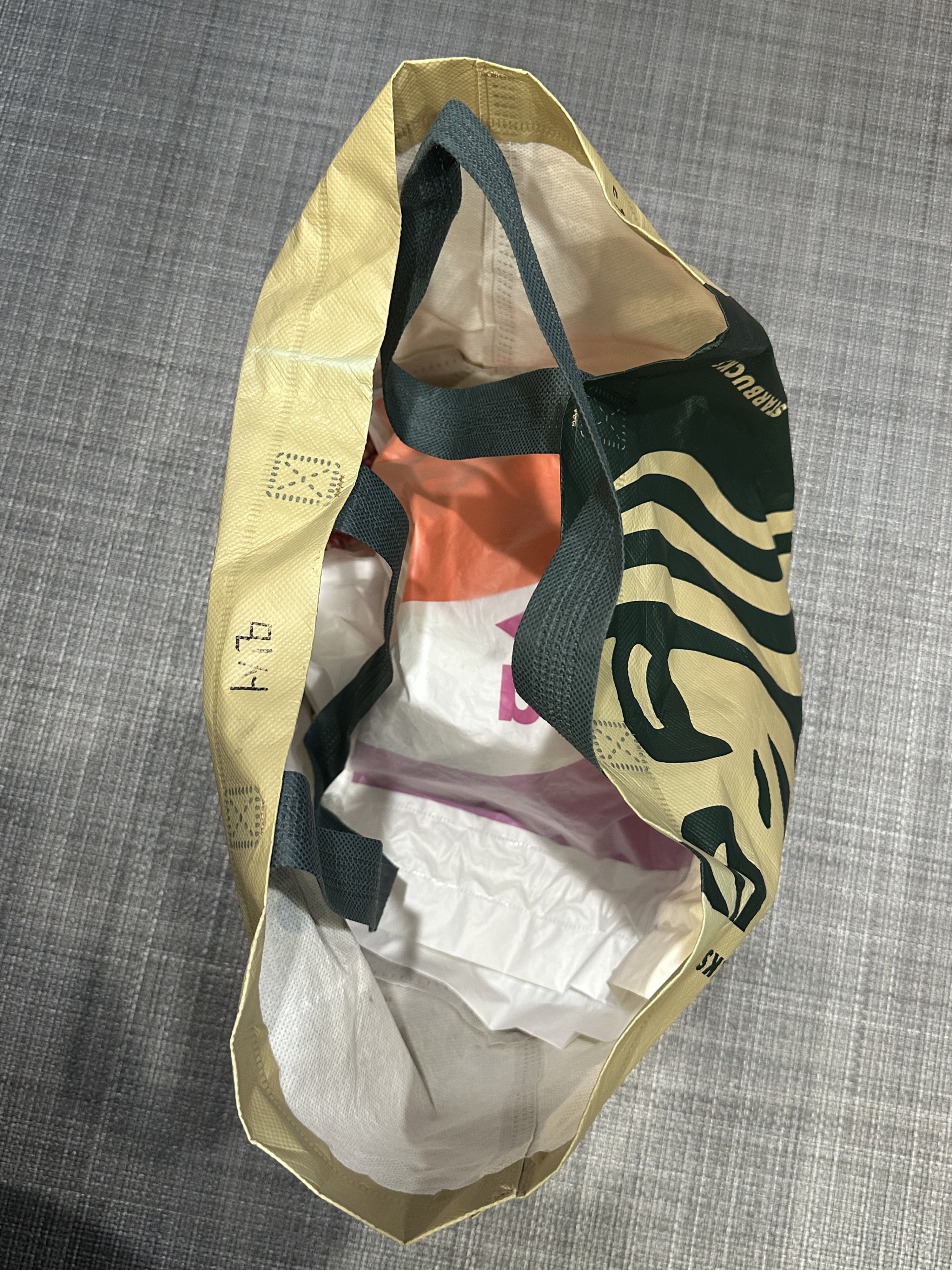 (가방에 민서라고 적혀있음/ 가방안의 물품: 유주원 스티커가 붙은 ARENA, 핑크색+주황색 아동용 모자, 검정색 아동용 바지, 아동용 티셔츠, 샤워용품들)