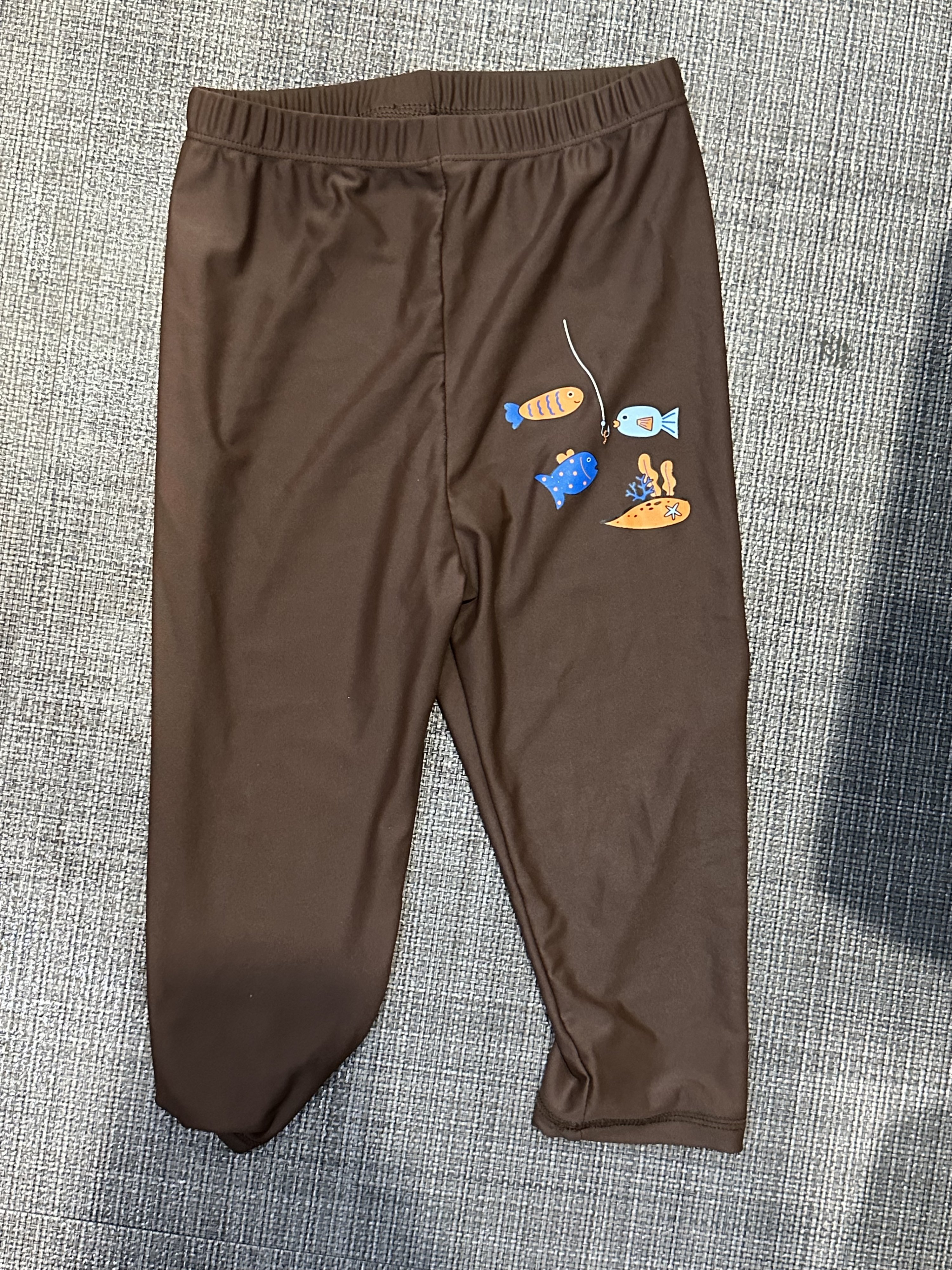 왼쪽 허벅지쪽에 물고기 그림이 그려진 갈색 아동용 하의