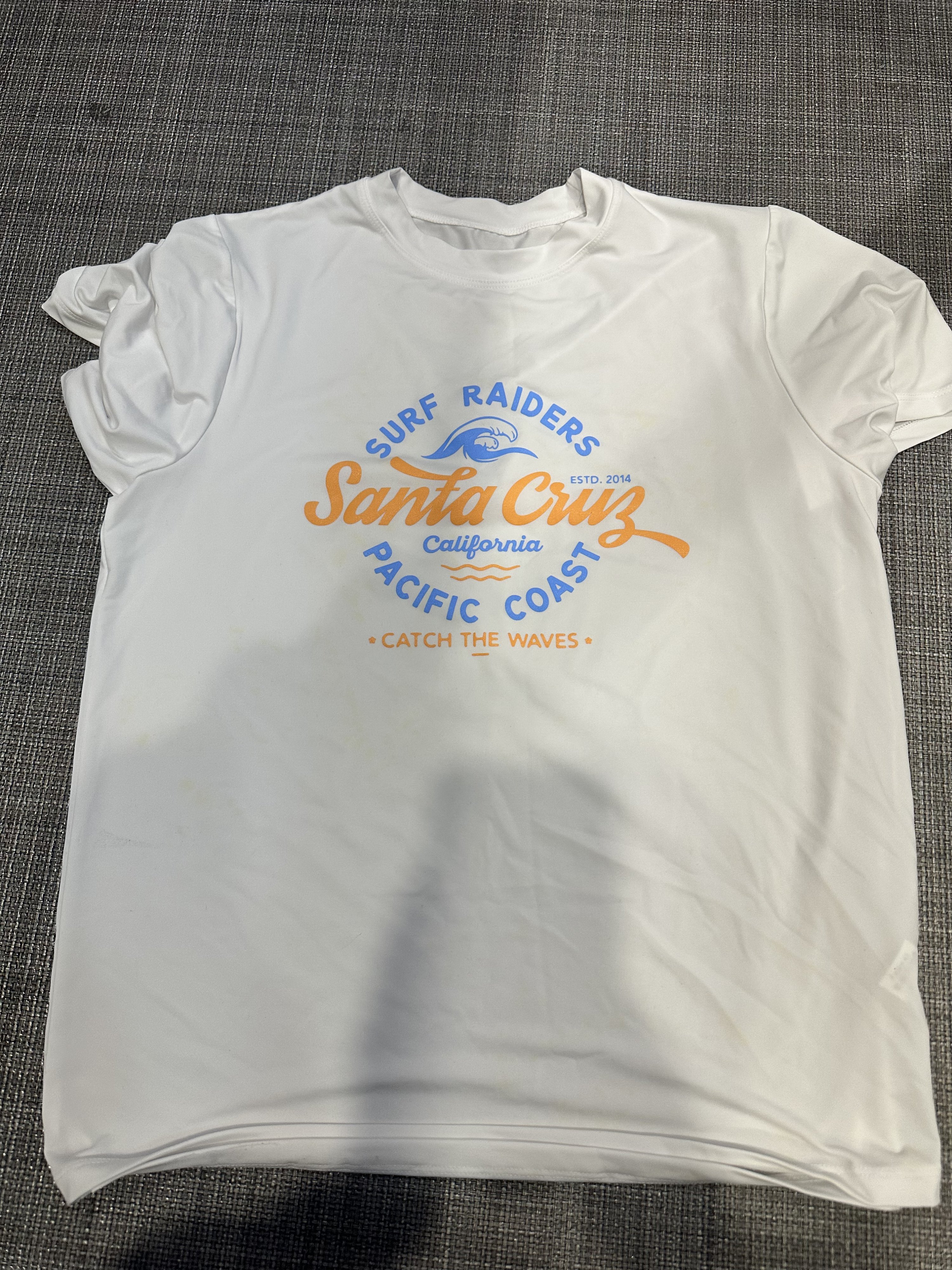 (1553) - [서프하우스] 의류 25.09.07 미처리 서프하우스 내 여자락커 습득 흰색 티셔츠파란색, 주황색 로고가 써있음.SURF RAIDERS PACIFIC COAST 수영복 텀블러 목록으로