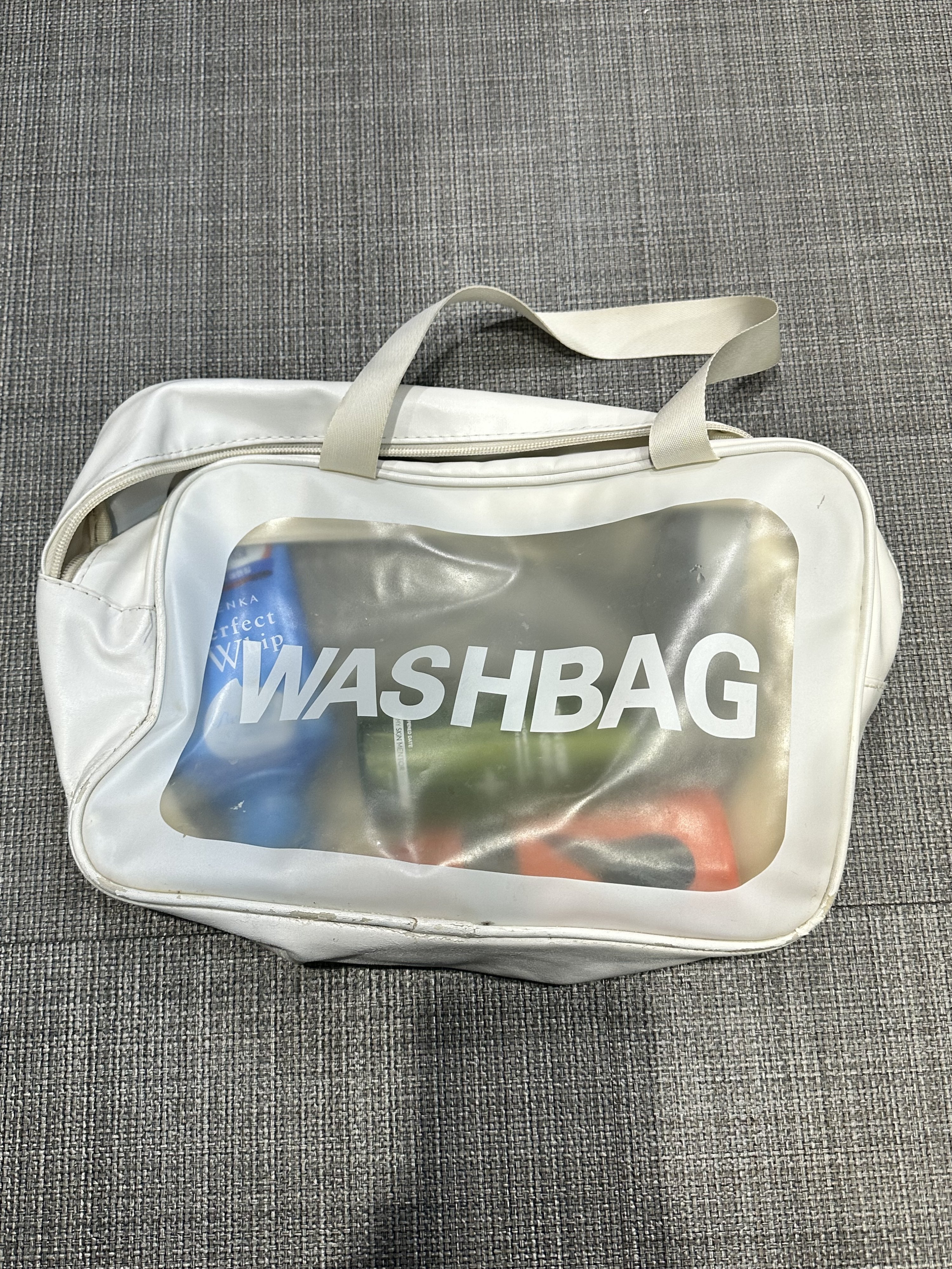 (1663) - [서프하우스] 파우치 25.09.20 미처리 서프하우스 내 남자락커 습득 흰색 테두리, 가운데 불투명 / WASHBAG라고 적혀있는 샤워 파우치안에 목욕용품이 들어있음. 모자 카드 목록으로