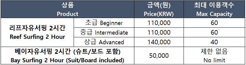 : 이용일 2일전 16시 기준 리프 서핑 예약률 30% 이상 시 오픈(운영 여부 개별 문자 안내)