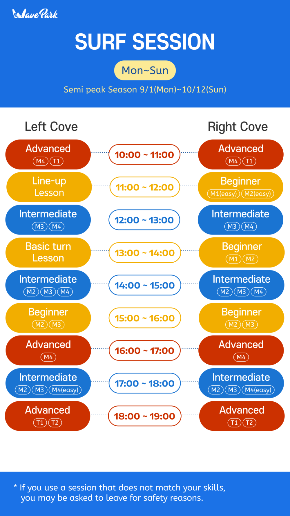 2025 Semi peak season Operation Hours & Surf Session (9/1~10/12) Eng ver. 25.08.08 2025 비수기시즌 운영시간 및 파도세션 안내 (10/13~10/31) 2025 준성수기시즌 운영시간 및 파도세션 안내 (9/1~10/12) 목록으로