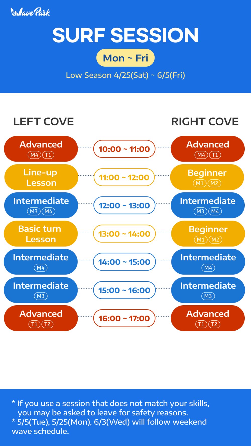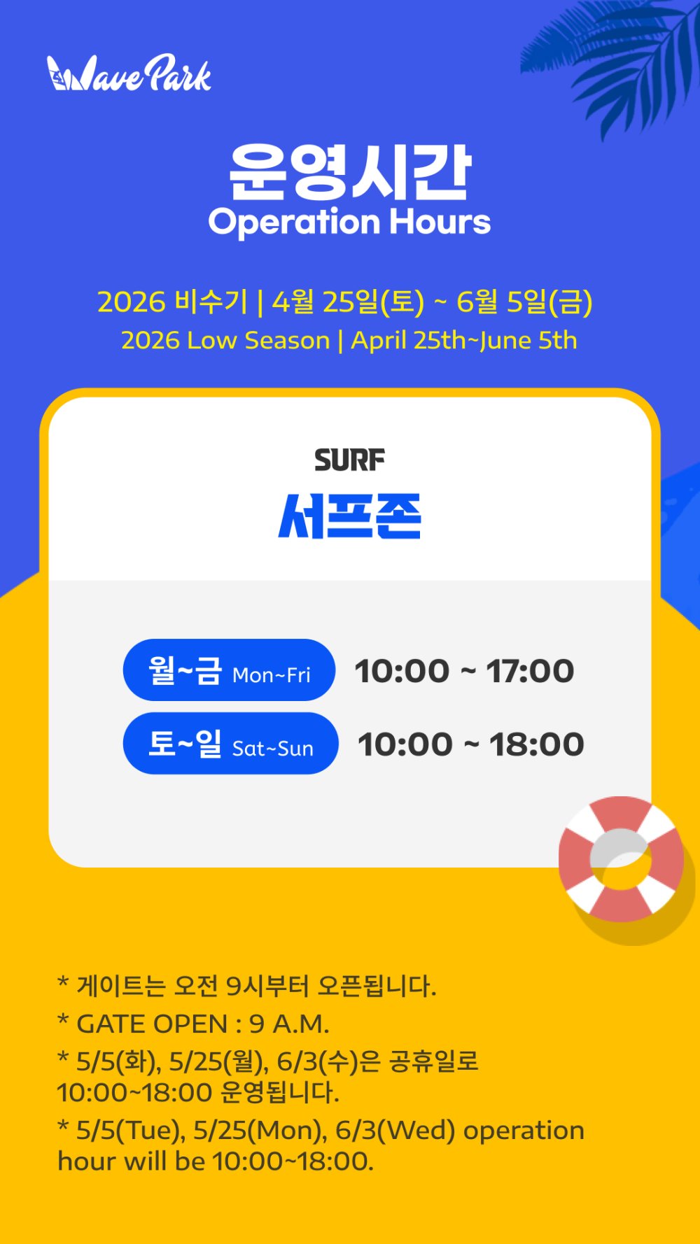 2026 Low season Operation Hours & Surf Session (4/25~6/5) Eng ver. 26.03.25 다음글이 없습니다. 2026 비수기시즌 운영시간 및 파도세션 안내 (4/25~6/5) 목록으로